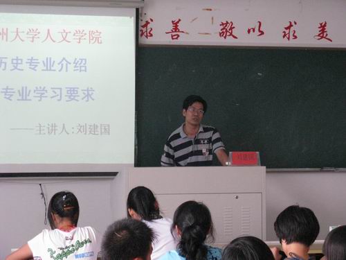 的院系概况,并着重介绍了历史专业的详细情况,展示并细致分析了专业培养方案。在该方案中,刘老师重点分析了历史专业的课程及学分设置,并对在场的同学提出了一些希望。接着,刘老师简要介绍了历史专业未来几年的实践教学和第二课堂活动,并向同学们展示了大量历史名胜古迹考察照片,以及一些专家名师讲座和社团刊物的情况,引起了在场同学的浓厚兴趣。最后,刘老师谈到了同学们最关心的学员质量问题,他通过介绍历年毕业生的就业与考研情况,以及今年优秀学员所取得的重大奖项,给予了同学们极大的鼓舞。与此同时刘老师还要求同学们要加强人际交往与自主学习的能力,努力提高自身素质。