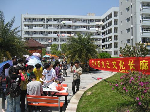 第七届百年语文之“文化长廊”活动正如火如荼的进行着,活动共分为“字谜宫”、“成语屋”、“名人轩”、“诗词斋”等七个游戏进行。参加活动的同学先从工作人员手中领过票,然后按照票上所示的游戏顺序依次进行过关。自第五关后,如被淘汰,即可返回上一关领取相应的奖品。C区中心花园里,人来人往,热闹非凡。工作人员们热情、耐心地为同学们讲解着相关规则,细心地为同学们解答相关疑问。“对联馆”里,同学们仔细挑选着题目,认真思考着,因过关而开心,不因失败而气馁。“二舰并行橹速不如帆快,八音齐奏笛清胜似萧和”,同学们才思敏捷,学富五车,具有深厚的文学功底,对的对联切合而又不失韵味。“诗词斋”中亦是如此,同学们毫不费力地就过了关。下午2:00,活动圆满结束了,工作人员认真清扫并整理了场地。