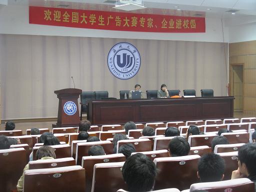 预赛特邀讲座--"广告创意与大学生广告大赛",在北校信息楼报告厅举行。本次讲座有幸请到了仙居县农业局农产品质量首席技术推广朱水星专家以及浙江大学广告专业主任胡晓云教授进行讲解指导。