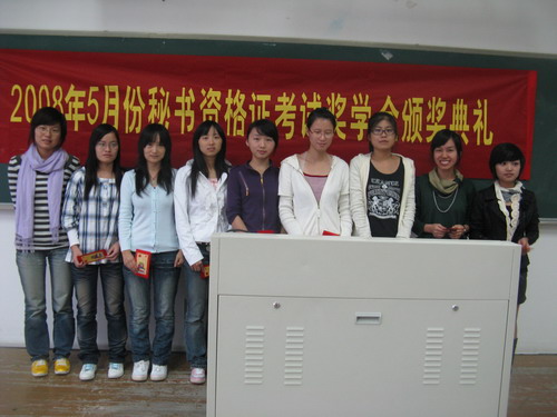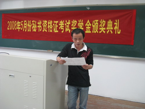 11月8日下午3:30分,2008年5月份秘书资格证考试奖学金颁奖典礼在樱花小说 北校1号楼201教室举行。颁奖典礼由温州市市点秘书事务所孙邦胜老师主持。参加本次领奖典礼的有秘书资格证考试奖学金颁奖人,即温州市市点秘书事务所的苏燕老师,樱花小说 团委学生会素拓部副部长张林峰以及获奖的12位同学。