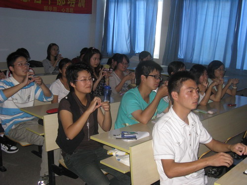 本次培训主讲人为手语协会的曹俊峰同学,培训对象为大一大二的青年志愿者干部。首先进行的是基本拼音字母的手语培训,曹俊峰同学一遍遍耐心讲解,志愿者干部个个认真学习,学习兴致十分浓厚。接着,主讲曹俊峰同学又教了一些日用品、食品、地名的手语表达,志愿者干部经过练习基本掌握之后又进行了集体分组的练习。第二课时主要学习内容是歌曲《阳光总在风雨后》的手语表达,志愿者干部热情高涨,纷纷伴着动听的音乐做起手语动作,现场十分温馨。