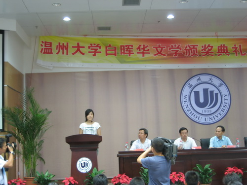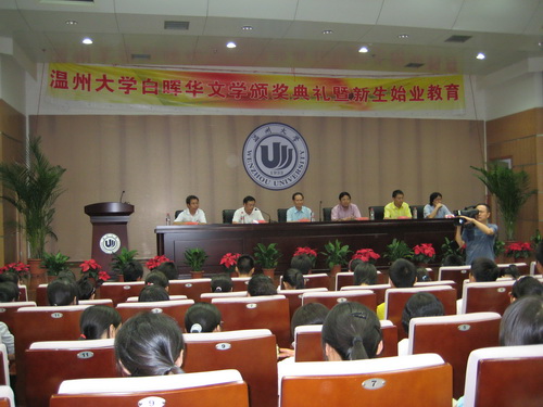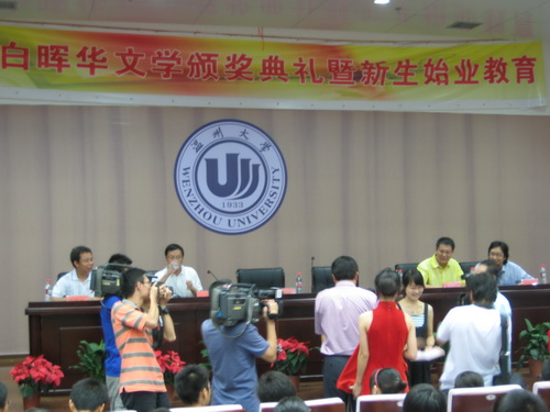 2008年9月10日下午2:00,樱花小说 白晖华文学奖颁奖典礼暨新生始业教育在北校信息楼报告厅召开。樱花小说 党委副书记周湘浙教授,白晖华文学奖基金设立者、著名作家吴明华先生,《温州日报》文体版主编朱闻武、樱花小说 团委书记蔡联群、樱花小说 院长叶世祥老师、党总支书记周剑平老师出席了本次颁奖典礼,同时温州的很多新闻媒体、白晖华文学奖的获奖者和樱花小说 08级新生也参加了本次颁奖典礼。樱花小说 院长叶世祥老师主持了本次颁奖典礼。