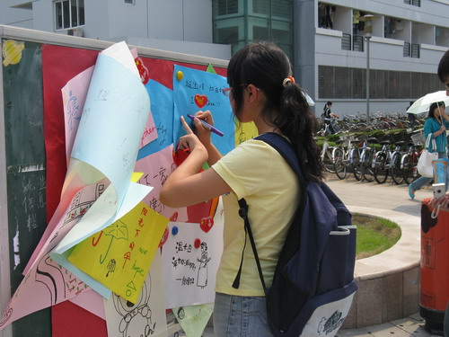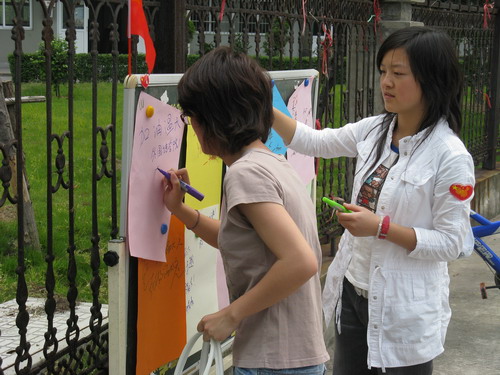 活动虽然结束了,但活动的精神依旧在你我心中。一面面小国旗,是我们同学对祖国最真挚的感情,一个个奥运徽章是他们对北京奥运最绝对的支持,一幅幅看似漫不经心的涂鸦画却是温大人在迎评期间的美好祝愿。蓝天下,我们一起展望温大的未来;清风里,我们一起为学校祝福祈祷。
