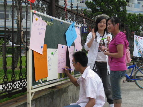 的建设与发展不仅关系到我们学生的自身利益,更离不开莘莘学子的努力与奉献。活动在下午1:00准时开始,我们的工作人员在愈来愈热烈的阳光下为来往的同学们讲述"亲近温大"系列活动的精彩内容,同时也积极邀请我们的同学为学校的发展献计献策,谈谈自己心中的温大的未来。工作人员辛勤汗水换来了同学们对此次活动的支持。路过的学生纷纷拿起画笔或接过工作人员递过来的水彩笔,在多彩的纸上构绘自己心中的温大蓝图。有的人勾勒出温大整齐的建筑群,有的人为学校的迎评加油,更有同学用手中的笔写下祝福的话语......