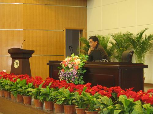 首先由曾繁仁博导开讲。他今天演讲的主题是关于生态美学的几个问题。曾教授深刻地谈论了世界环境及中国生态存在的严重危机,指出了生态美学的宗旨。"人当诗意地栖息在大地上",我们人类只有一个共同的家园--地球。生态美学观念是每一个公民都应建立的观念。