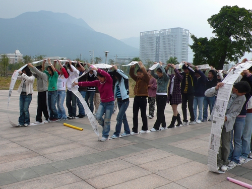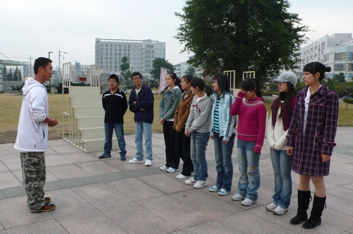 一大早,大家就早早地聚集在了训练地点。阴冷的天气丝毫没有影响同学参加的积极性,大家各个精神饱满,等待着这次令人期待的训练。随着训练师强有力的整队声,我们的训练就正式开始了。为了振奋士气,训练师首先要求各个队伍设计自己的队徽、队歌,并响亮地喊出自己的口号。接下来,队员们进行了帝国战车、钻蜘蛛网、信任背摔等活动。给队员们留下深刻印象的就是信任背摔,这是一项考验队员勇气和对队员们信任的活动。一位队员从高架上背向笔直摔下,其余的队员们在低处将那位同学稳稳地接住,俗话说:“用人不疑,疑人不用。”个人的安全全部系在队友的双臂上,这就需要大家充分地发挥团队精神。