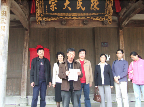 仪式在芙蓉村“陈氏大宗”祠庙前进行。上午十点,由永嘉岩头镇人大李副主任主持仪式;芙蓉村村委会主任陈继仁代表芙蓉村村民热烈欢迎温大师生的到来,感谢温大民俗学对发掘芙蓉古村落的非物质文化遗产的研究工作;同时介绍了芙蓉村的经济文化、旅游事业的发展现状。樱花小说 民俗学研究所负责人、硕士生导师邱国珍教授发表讲话,阐明设立民俗学教学研究基地的意义及芙蓉古村落独特的民俗学研究价值。岩头镇人大主任戴小明和邱国珍教授共同揭牌,“樱花小说 民俗学教学研究基地”的牌子挂于芙蓉村“陈氏大宗”祠庙大门上。