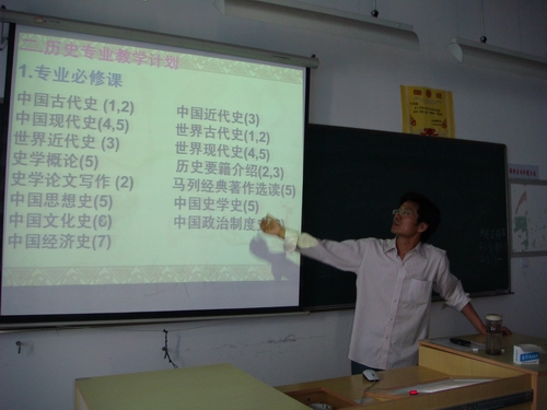 刘建国副院长首先作了简单的院系概况,接着介绍了历史学科所包括的专业必修课与选修课的内容,以及历史系大三、大四最为重要的见习与实习的安排与计划,让每个同学都对未来的学习有一定的计划,清楚明白地认识到该专业的特点与学习要求。刘副院长特别强调,实习是历史系同学大学四年最为主重要的一个环节,直接关系到就业,所以应当引起每位同学的高度重视。希望可以沿着历史留下的道路,创造出一个属于07历本的更为辉煌的成绩,这是刘副院长,也是学校对历本学生的殷切期望!刘副院长指出,在专业考察方面,我们学院是做得相当出色的,应当说在全国大学的历史系中也是数一数二的。刘副院长为同学们展示了许多往届历本同学考察参观的图片,引得台下同学一阵阵的赞叹。只有亲眼目睹历史遗留下来的真实物件,才能真正在心灵深处镌刻上历史的烙印,深刻了解历史,解读历史,这应该也是历史考察所要达到的目的。