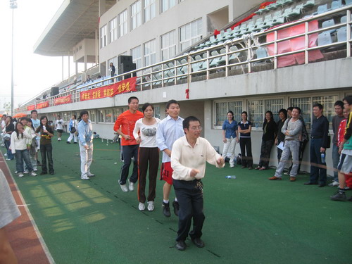 运动会不仅仅是属于学生的,教工组的比赛也正热火朝天的进行着,与学生互动的合作更是配合默契。老师们老当益壮,运起球来丝毫不比学生们逊色,投篮的精准度多次让学生们惊呼不已。跳绳比赛则纯属娱乐性质,一群人随着绳子起舞,其乐融融。80米迎面接力中,教工组更是以其惊人的速度遥遥领先。