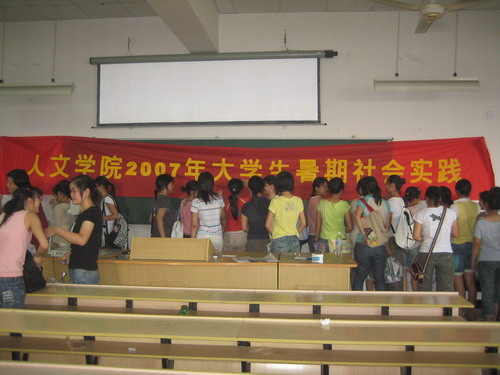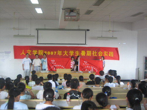 为进一步贯彻落实我校关于暑期社会实践的有关规定,对参加社会实践的同学在思想行动上进一步动员.7月6日下午4点,樱花小说 07年暑期社会实践启动仪式在1号楼203教举行。教室里人头攒动,参与此次社会实践的所有同学都参加了此次会议。院党总支书记周剑平到会并发表讲话。