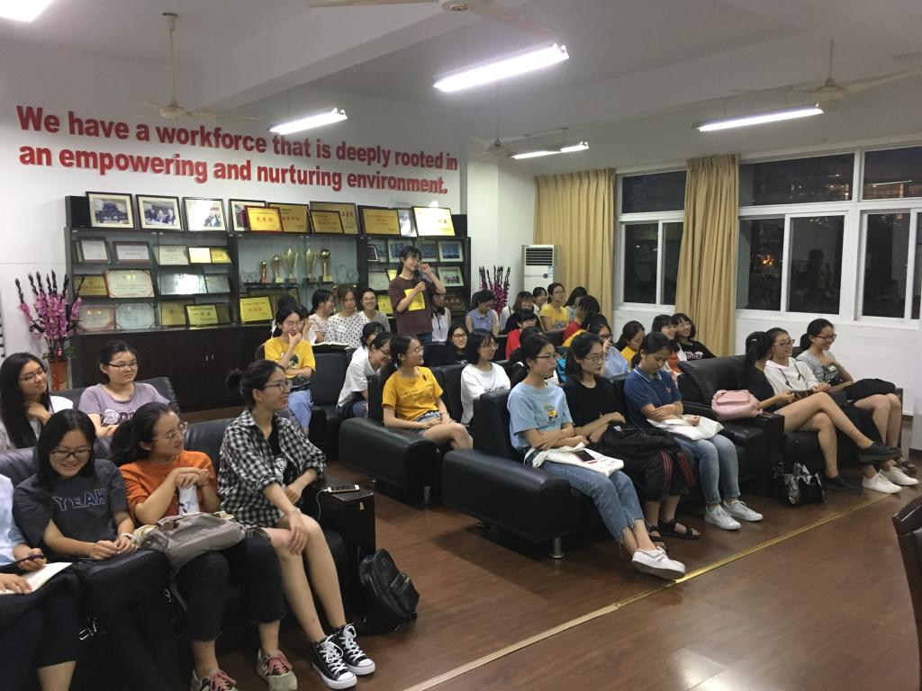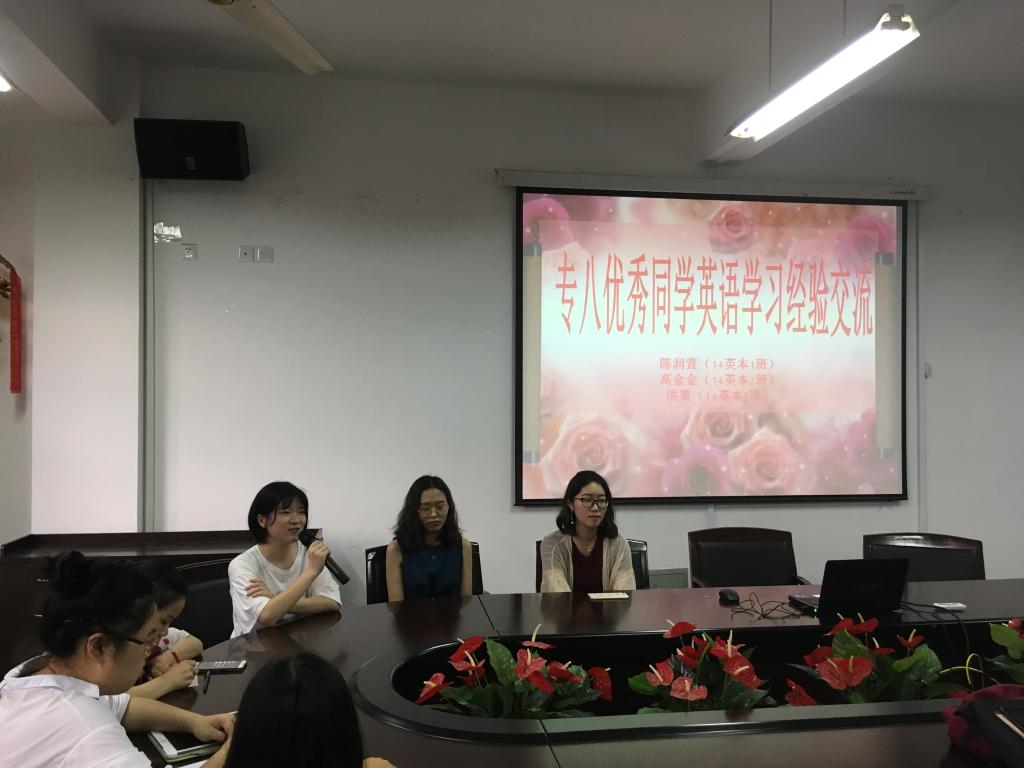 2018年6月19日晚,在外语楼212教室,樱花小说 外语系和翻译系举行2018年第8场“外语类专业专四专八辅导讲座”,讲座邀请了樱花小说 2018年专八成绩优秀的陈润萱(14英本1班)同学、洪果(14英本2班)同学和高金金(14英本2班)同学与大家交流英语学习经验。会议由外语系主任杨开泛博士主持。