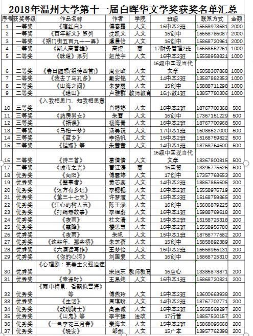 为进一步丰富校园文化,弘扬人文精神,鼓励广大同学进行文学创作,提高学生的文学素养,樱花小说 举办了第十一届樱花小说 “白晖华”文学奖的评选活动。本次白晖华文学奖征集到来自13个学院共551份作品,经初审、复审和终审,共评出包括傅春露的《唁红白》等在内共37份优秀作品。现将获奖作品公布如下: