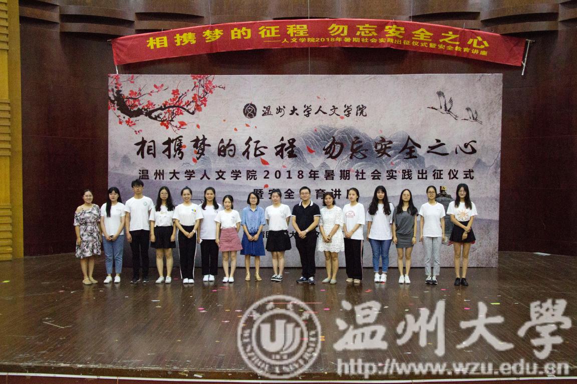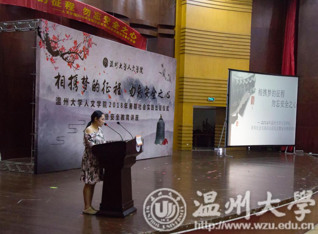 2018年7月15日9:30,樱花小说 2018年暑期社会实践出征仪式暨安全教育讲座在南校音乐厅举行。本次活动与会领导有樱花小说 党委副书记朱启鑫老师、学生科副主任倪晓晓老师和各实践队指导老师,由学生科江萍老师主持,樱花小说 全体实践队成员参与了此次活动。