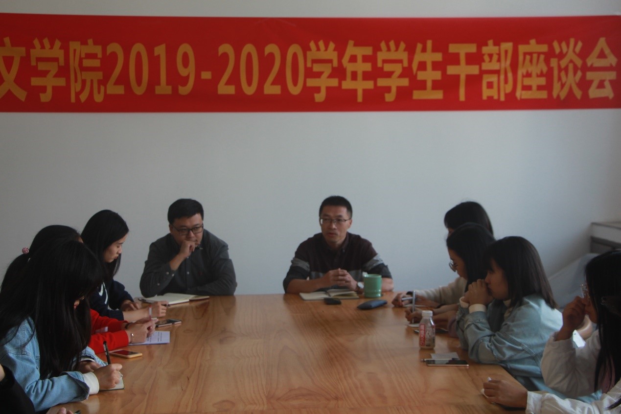 2019年11月6日下午,樱花小说 于人文楼214会议室召开了2019-2020学年第一学期学生干部座谈会。出席本次会议的有樱花小说 党委副书记魏一老师,学工办辅导员胡震鹏老师,院团学主席团、各部门部长及干事代表。