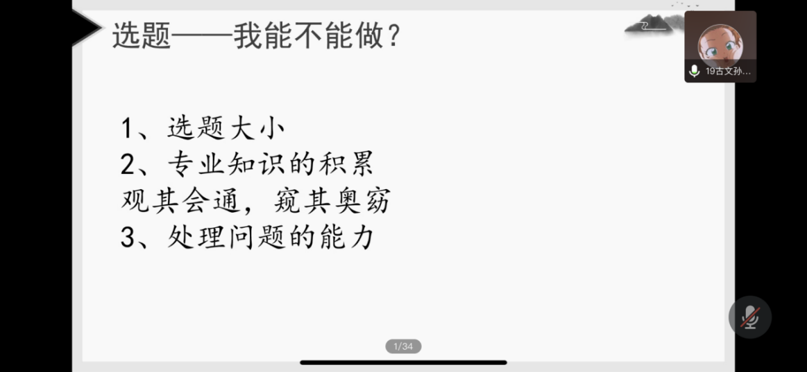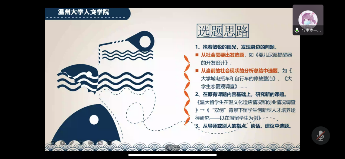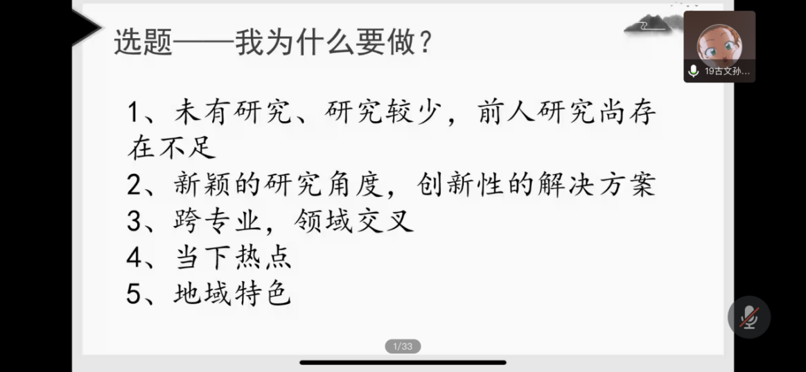 孙若琪同学认为关于选题可以从选择的目的和自身的能力两个方面去思考,从而对选题有更清晰的认知。她还推荐了研究工具以及实用公众号,也提及申请书的撰写。最后,她强调一定要有自信,科研立项其实并没有想象中那么困难。