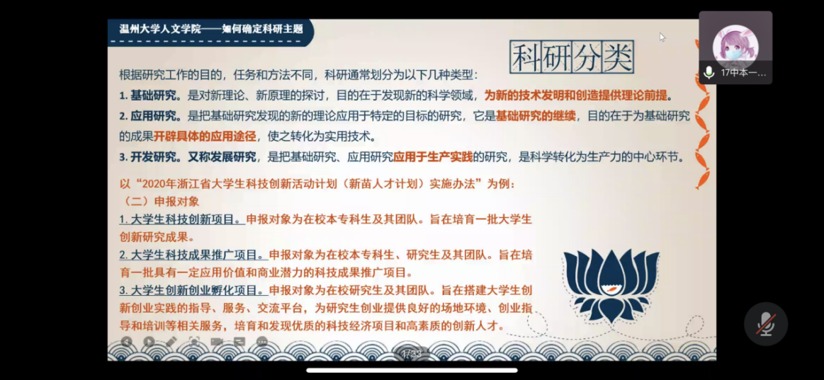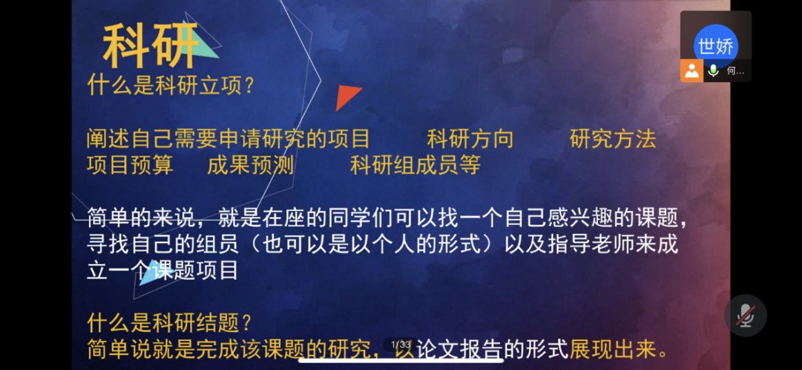 随后,主持人对于科研流程、立项流程、注意事项以及往年立项情况等进行简单介绍后,几位学长学姐进行了经验交流与分享。