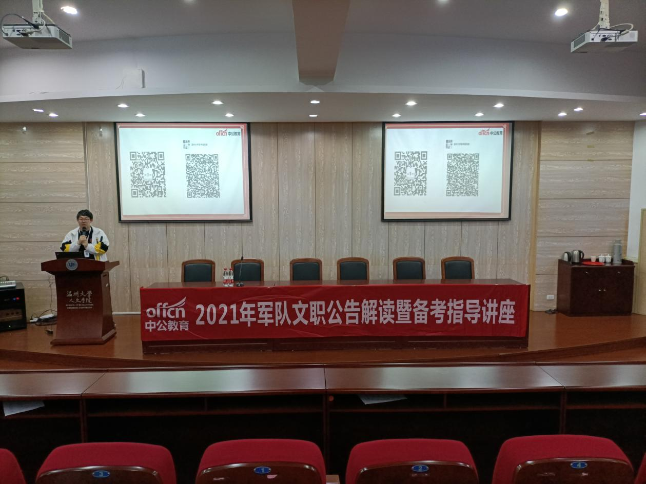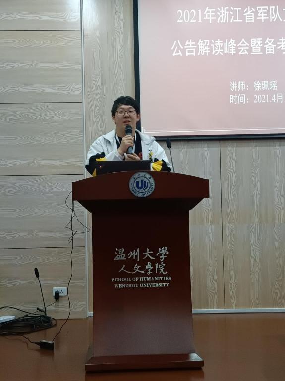 2021年4月10日19点30分,浙江省军队文职考试成绩公告解读峰会暨备考指导讲座在樱花小说 人文楼203报告厅如期举行。本次主讲人徐佩瑶老师,从走进文职、招考政策、报考指导、备考指导四个方面深入介绍了军队文职岗位的相关信息,让同学们对其有了一定的了解和认识。