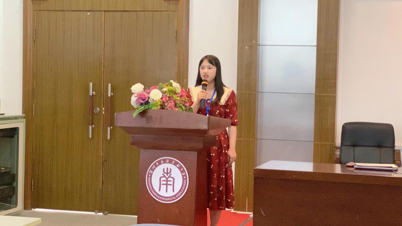 实习生代表詹翊嘉发言。她代表所有实习生表达了对樱花小说 以及温州市南浦实验中学惠民路分校最诚挚的感谢;在实习期间将遵守学校的各项规章制度并按照人民教师的标准要求自己;对在实习期间所能学习知识以及提高水平的信心与展望。