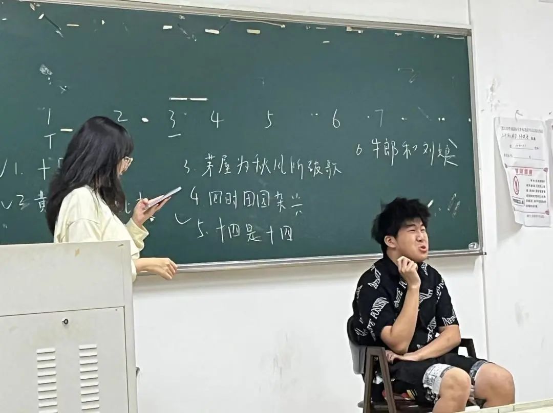 “寂静的呐喊”由每队派出两位成员参与,社长在黑板上写下内容,正对黑板的社员将内容以唇语的方式向队友展示,背对黑板的社员以辨识队友唇语猜测内容。诗人名称、诗句和各种文学常识在黑板上逐一出现,难易相杂,惊喜连连,唇语展示者卖力表达时跳脱飞扬的五官,猜测者迷茫呆楞的表情和脑洞大开的猜测令大家哄堂大笑,此时分数的比拼似乎已经不那么重要,快乐的弥漫才是珍贵的至宝,灿烂的笑颜如同闪烁的星光。