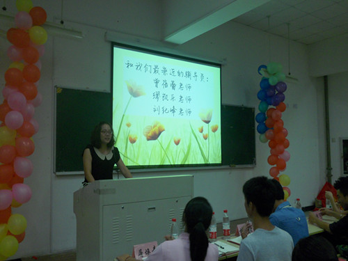 幻灯片放到辅导员寄语这一页,曾蓓蕾老师在同学们的掌声中上了台。曾老师先是微微一笑,便给了同学们特别的亲切感,她真诚地欢迎新一届学生的加入,并鼓励新生积极参加学生会来锻炼自己的能力。之后,她指出,学生会的主要任务就是学院品牌建设和学习方面的管理服务,并希望新生能够支持学院的工作,也希望团委学生会能够成为学生和学院的有效交流平台,能真正做好服务同学这件事。