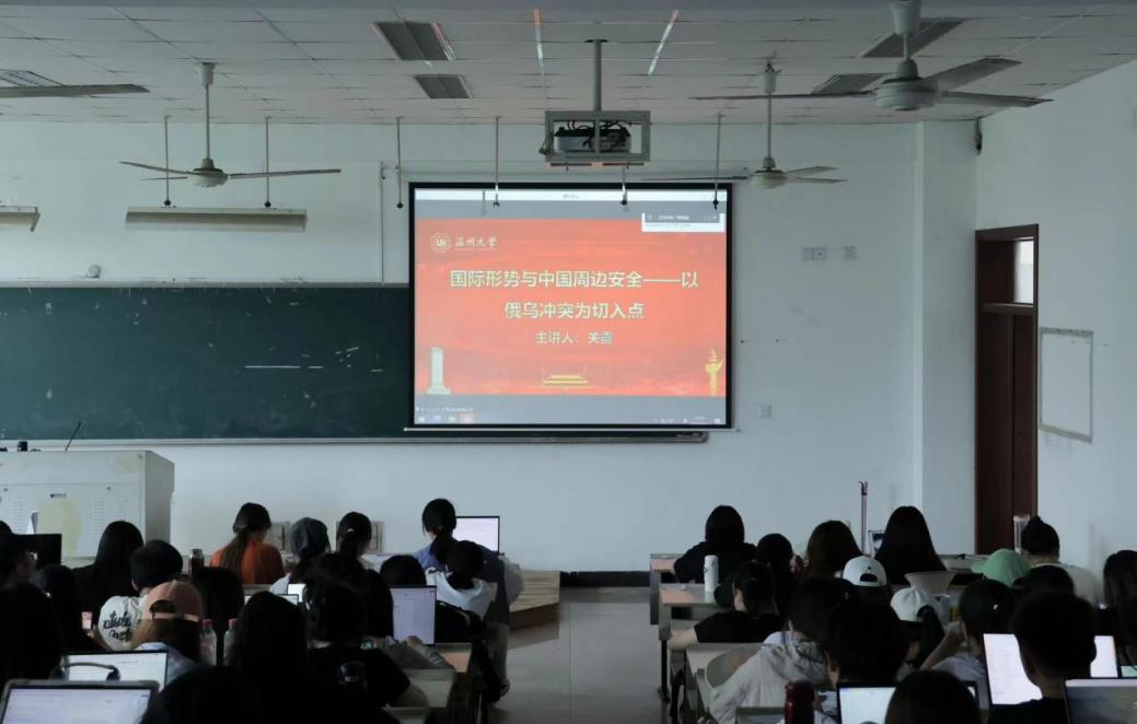第三讲专题马克思主义学院青年博士关震老师以俄乌冲突为切入点,为同学讲解了国际形势与中国周边安全的问题。老师从“深刻认识百年未有之大变局”“中国周边安全形势分析”“大国博弈下的俄乌冲突”三个方面展开讲述。当今世界权力中心逐渐从大西洋向太平洋转移,权力分布从美欧等发达国家向金砖国家等发展中国家转移。在中国共产党的带领下,中华民族迎来了站起来、富起来到强起来的伟大飞跃,迎来了实现中华民族伟大复兴的光明前景。关震老师强调了国家主权的重要性,并提出对新时代的展望:今日之中国必将以更开放的姿态拥抱世界,以更有活力的文明成就贡献世界。