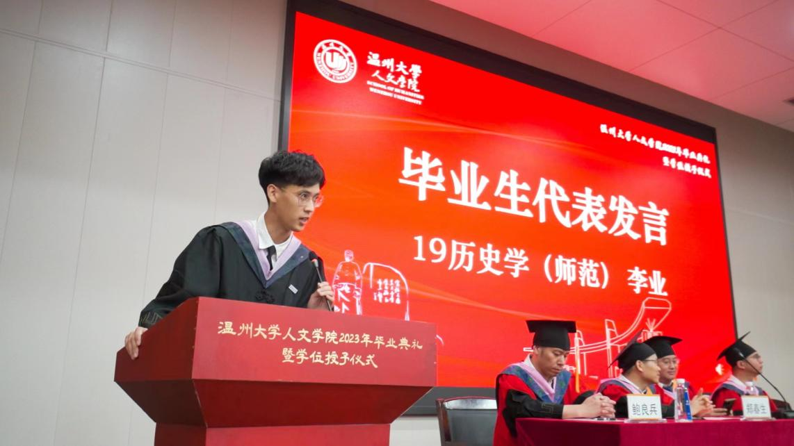 “要以路漫漫其修远兮,吾将上下而求索的恒心和决心,在祖国大地上书写属于温大人的华章。”研究生毕业生代表20中国古代文学李兰兰同学如是说道。本科生毕业生代表19历史学(师范) 李业同学则表示:“我们定将继续秉持温大人‘求学问是,敢为人先’的精神,力争上游,勇立潮头,在各自的领域发光发热。”