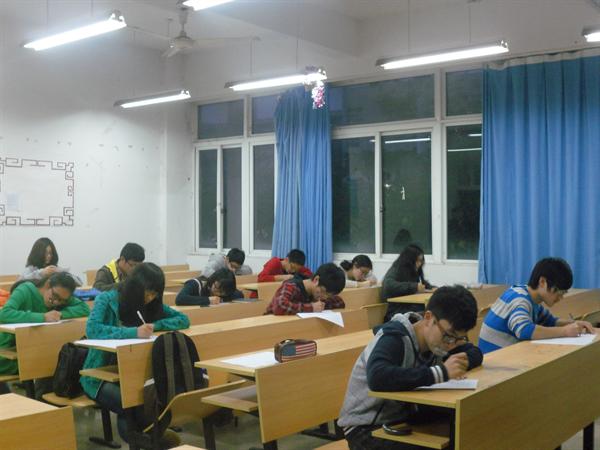 团学主席团主持,经过主席杨立忠的简短介绍与嘱咐后,考核正式开始。首先,主席团成员向团委学生会干部派发试卷。由于大一、大二的学生干部考卷有所不同,大一干事被安排在102教室进行考核,大二部长则在105教室。毕竟是第一次参加团学内部考核,大一干事不免有些紧张,试卷发到手之后,便可见他们低头拾笔,认真阅卷,开始奋笔疾书。教室里显得非常安静,只有刷刷的写字声以及偶尔试卷翻页发出的声响,主席团成员不时在教室中走动,以便观察同学的答题情况。较于大一干事,大二的部长们则显得沉静老练的多,并没有初时的紧张,他们显得有些严肃,相同的是他们拿到试卷后一样马上动笔,整个考核现场神圣有序,大家的注意力都集中在考题上。