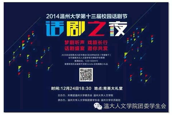 2014年12月24日18:30,"梦剧听声,戏旅长行"樱花小说 第十三届校园话剧节话剧之夜在育英大礼堂正式开演。此次活动由共青团樱花小说 委员会、樱花小说 主办,樱花小说 团委学生会和樱花小说 农历剧社承办。院党总支书记吴静,院副院长孙良好,校团委陈莹老师等和到场的同学们共同享受了一场视听盛宴。