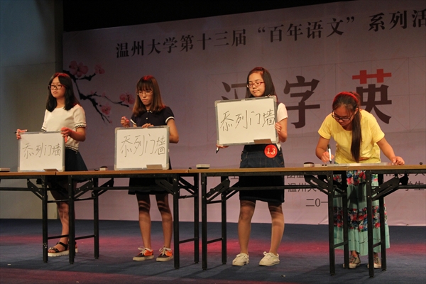 陈萍萍同学、外国语学院陈娜娜同学分别斩获“汉字榜眼”、“汉字探花”称号。接下来,按照赛程安排,“汉字状元”董天圆同学要与去年汉字英雄冠军-来自瓯江学院的何凡同学展开一场终极对决。这轮PK的试题以字谜与成语猜谜为主,难度大大增加。两大高手互不相让,激烈比拼,使全场气氛达到了最高潮。最终,何凡同学守擂成功,荣膺“汉字英雄”称号。整场比赛在热烈掌声中圆满落幕。