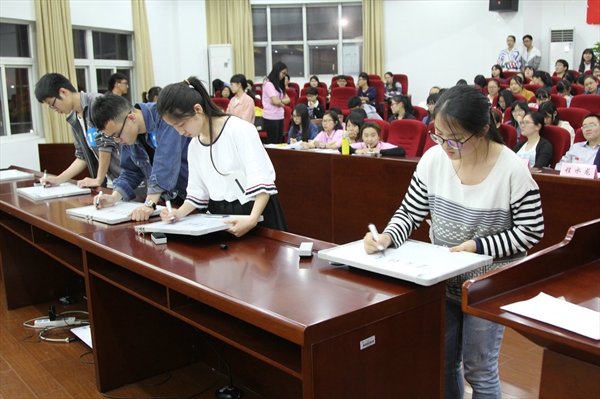 随后比赛正式开始,第一环节为“争分夺秒”,五人一组,每人根据屏幕给出的图片,在90秒内尽可能多的找出成语并写于题板上。得分前7名的选手直接晋级第三环节,而剩下的9名同学进入第二环节“逃出生天”复活赛。选手们个个脑洞大开,实力相当,加时赛竞争相当激烈,不由得让观众们叹为观止。比赛间隙,李爱红、程水龙两位“汉字先生”针对有争议的字词给予了专业的判断和分析,精彩的解说增加了大赛的可看性,也使现场观众掌握了不少汉语知识。