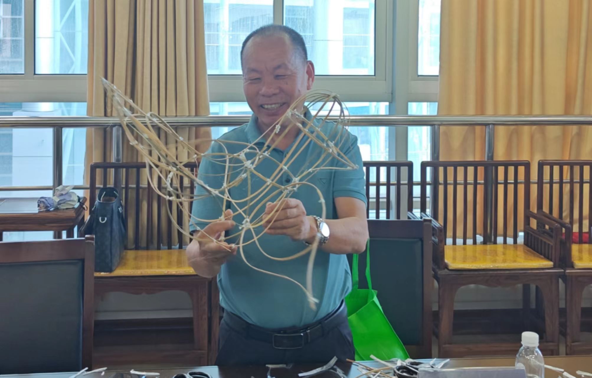 接着,王大普先生为同学们演示百鸟灯骨架的制作。两百多年来,百鸟灯的材料、工艺都得到极大改良,匠人们大胆运用五色油彩,使得色彩搭配艳丽和谐;用纱布代替薄纸,使得灯具更便于使用和保存。只见他拿起竹条,扎出一个个竹圈,竹圈灵动地组合,一只大鸟的轮廓就在他手中生成了。制作过程中,他目光专注,手法娴熟,展现出了精益求精的匠人精神。同学们对制作工艺十分感兴趣,全程目光跟随,沉浸在”百鸟灯“制作的魅力之中。