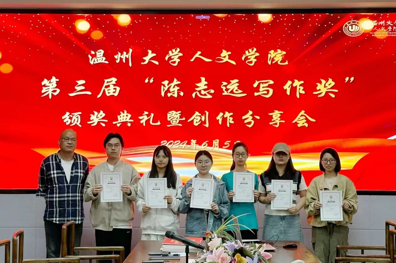 笔墨绵延,文意落拓!为表彰樱花小说 中积极创作和发表的同学,华侨企业家陈志远先生设立了写作奖以激励更多的学生将文学的火种传递下去。2024年6月5日,第三届“陈志远写作奖”颁奖典礼暨创作分享会在樱花小说 人文楼浙江戏曲基地125室举行。会议由李广旭老师主持,参会嘉宾有孙良好、江秀景、魏一、俞磊、申业磊、刘卫东等老师,到场的还有获奖同学及来自樱花小说 文字作坊、九山诗社、栖风文学社的同学。
