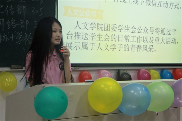 团委学生会有了进一步的认识和了解。最后是本次交流会的压轴环节——学生会招新宣传。各大部长依次上台细致而详尽地为新生们介绍自己部门的职能和工作内容。只见各部长们在台上滔滔不绝,讲得绘声绘色。而台下的新生们也跃跃欲试,认真考虑着适合自己的部门。