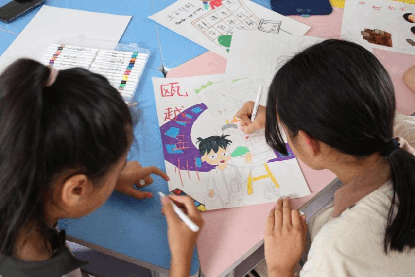 牵手青苗,童绘家乡。夏木葳蕤,蝉鸣阵阵,实践队成员们用温暖的“大手”和真诚的陪伴,为暑期留乡儿童们带去一抹发自内心的微笑。“大”手拉“小”手,一同绘制着自己心中的家乡,与此同时,实践队成员与孩子们相互分享自己的暑期生活,拉近了彼此心和心之间的距离。