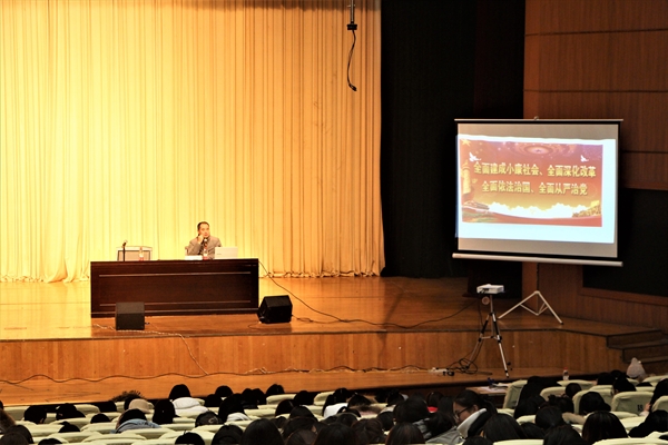 于育英大礼堂开设形势政策课之从严治党解读。本次课程由教室教育学院党总支书记杨立淮老师主讲。大一全体学生参加了此次课程。