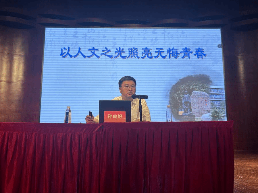 新生见面会后,由孙良好院长带来“院长第一课”。孙良好院长代表学院对新生们的到来表示真挚欢迎,并为全体新生带来院长第一课。孙院长从人文之源与学院理念讲起,百年人文,薪火相承,学院不仅有深厚的人文底蕴,还有着一流的人文师资和专业、学科和基地。谈及大学之道,孙院长主张新生要做到“读万卷书”与“行万里路”的知行合一,更要在学习中做到“入乎其内,出乎其外”,潜心学问,成为一个“腹有诗书气自华”的人。最后,孙院长以“认识你自己”做结,寄望同学们以独立之精神,发自由之思想。