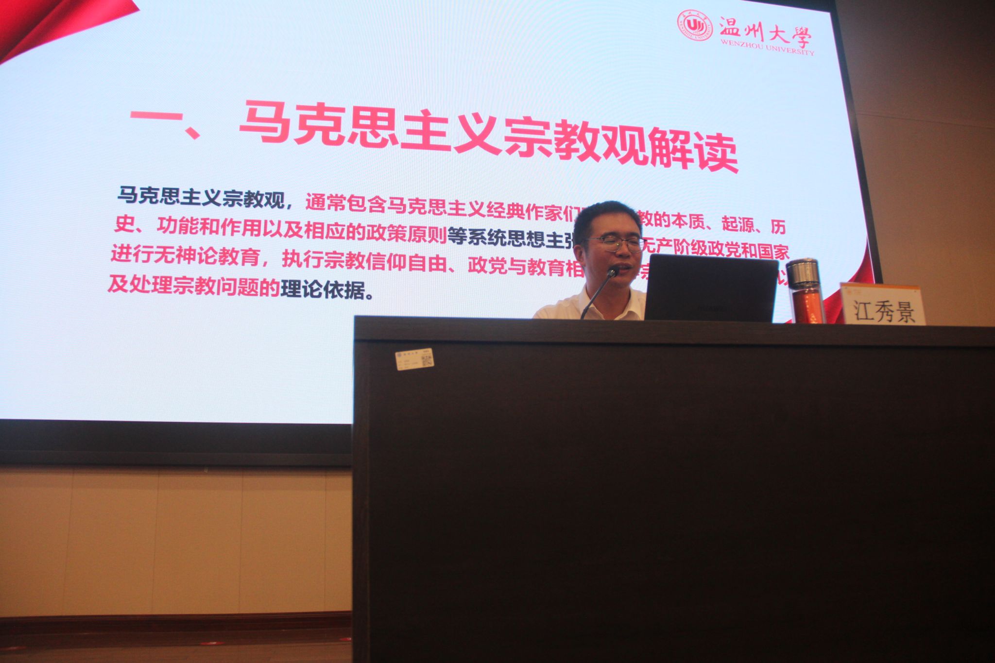 第一节课由我院党委书记江秀景老师主讲。江秀景老师首先阐述了马克思主义的宗教观,并详细介绍了中国共产党的宗教工作政策。他结合自己的工作经验对全体本科新生提出自己的期望,希望同学们“用党的科学理论武装自己、立鸿鹄志、做奋斗者”。同学们深受鼓舞,以热烈的掌声回应,彰显了青年学子的使命与担当。