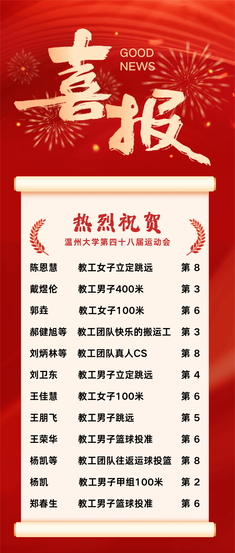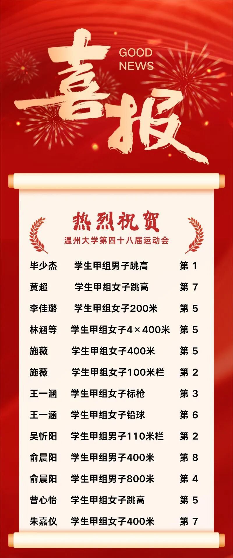本届校运会获奖名单: