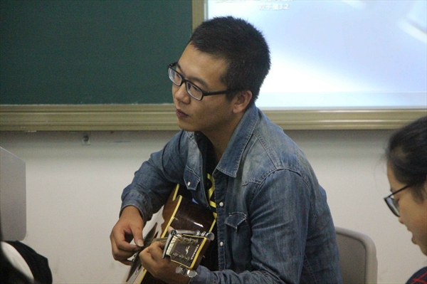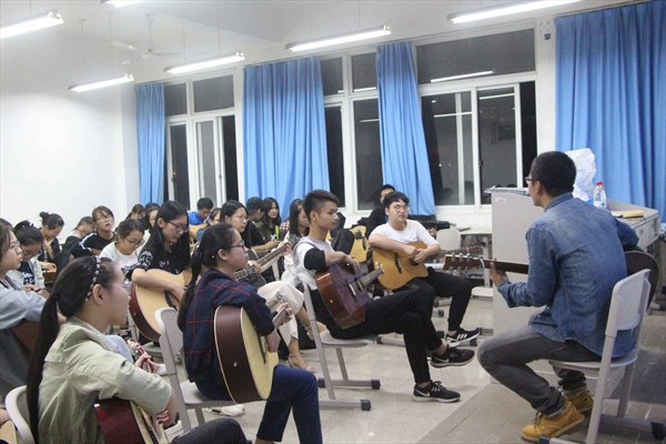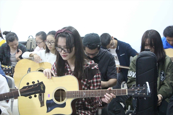 首先,姜老师用风趣幽默的故事讲述了自己在大学如何与吉他结缘。这段特殊的经历使本来高不可攀的格调很轻松的回归亲切的日常生活。紧接着姜老师耐心指导学员们进行准备工作,调弦,一时间铮铮琴音似流水般在教室里淌开。姜老师又详细介绍了吉他基础,从手指,手臂摆放姿势到用力轻重都一一讲解。学员们聚精会神,虽然刚刚起步,但满腔的热情不容置疑。场面一片热闹,洋洋琴音不绝于耳。课时接近尾声,老师以一首遇见献给在场全体学员,优美的旋律使人迷醉,雷鸣般的掌声经久不息。