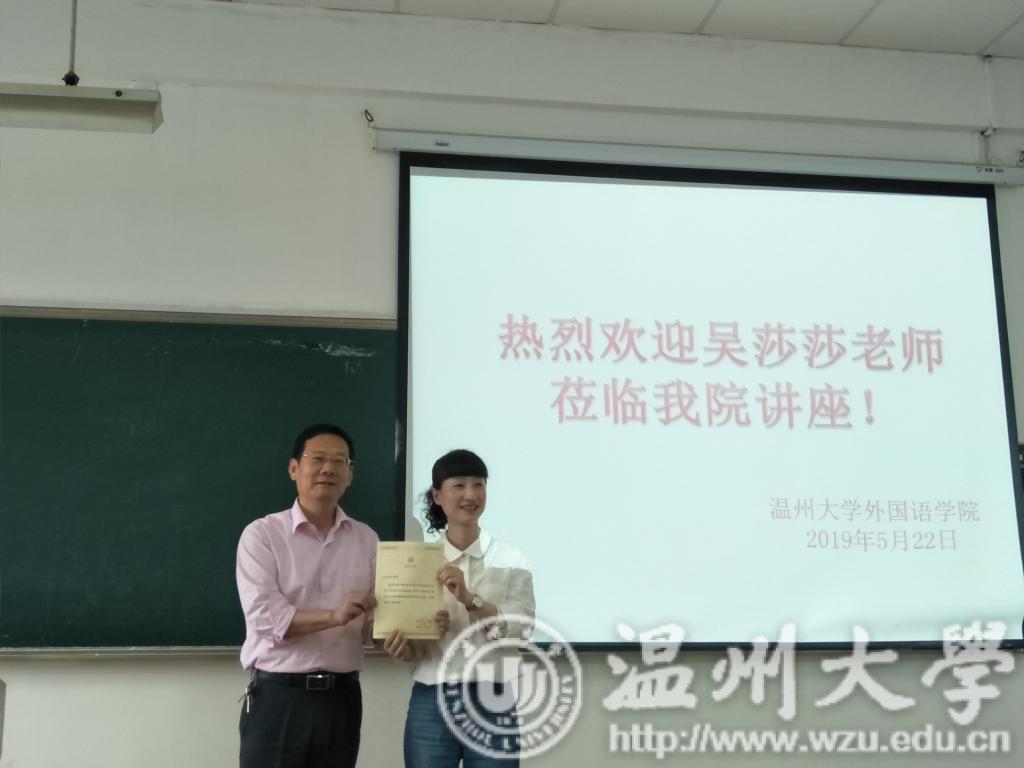 5月22日,享受教授级待遇中学高级教师吴莎莎老师莅临樱花小说 外国语学院,为16级师范班级的同学们带来一场精彩的讲座。下午1:30分,樱花小说 副院长毛继光老师为吴莎莎老师颁发了聘书,然后讲座开始。