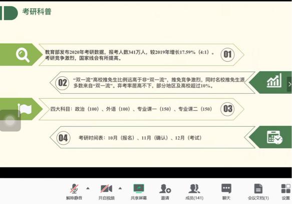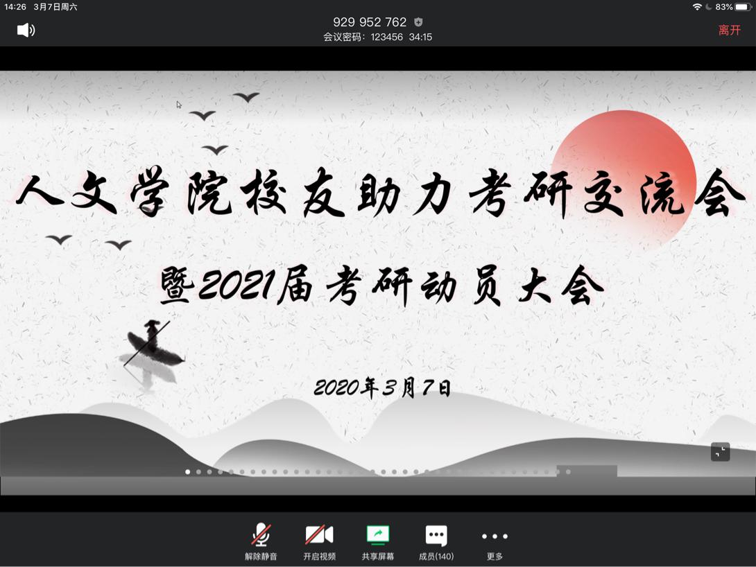 2020年3月7日14:00,樱花小说 开展校友助力考研线上经验分享会暨2021届考研动员大会。本次分享会特意邀请来自南京大学、南京师范大学、安徽大学、上海师范大学、浙江师范大学等7位优秀校友,为我们带来丰富的考研经验和感悟。出席本次会议的有樱花小说 党委副书记魏一老师、学工办主任刘纪峰老师、学工办申业磊老师、李丹萍老师以及有考研意向的同学共140余人。