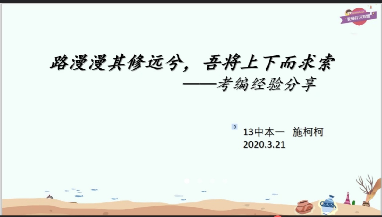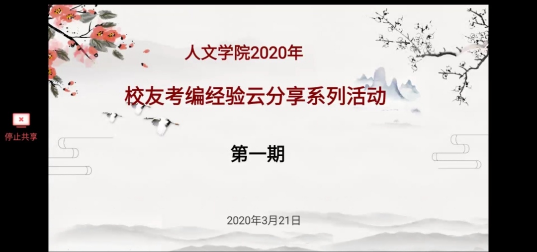 为帮助学生们更好地了解考编,助力同学们的考编之路,2020年3月21日19:00,樱花小说 在腾讯会议上开展了第一期校友考编经验云分享活动,院党委副书记魏一、学工办辅导员李丹萍、两位优秀毕业生以及有意考编的同学共60余人参加了此次活动。