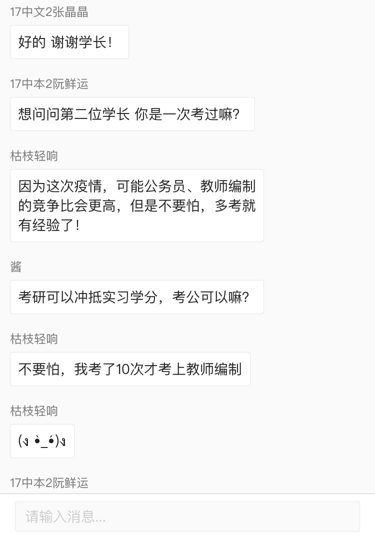 在交流互动环节时,两位校友就各种具体问题进行了耐心仔细的讲解和回答,刘纪峰老师对回答做了部分补充,解答了同学们的疑惑。“星光不问赶路人,时光不负有心人”,只有汲取经验并付诸实践,不断积累,方可成功上岸。