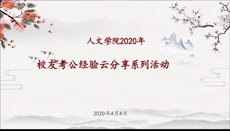 为了帮助同学们更好地备考公务员考试,樱花小说 于2020年4月4日19:00开展了校友考公经验云分享活动,这也是2020年校友考编考公经验云分享的最后一期活动。院学工办主任刘纪峰、辅导员李丹萍、两位分享校友和部分有意向考公的学生参加了此次活动。
