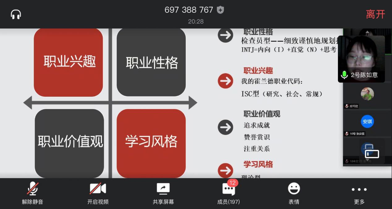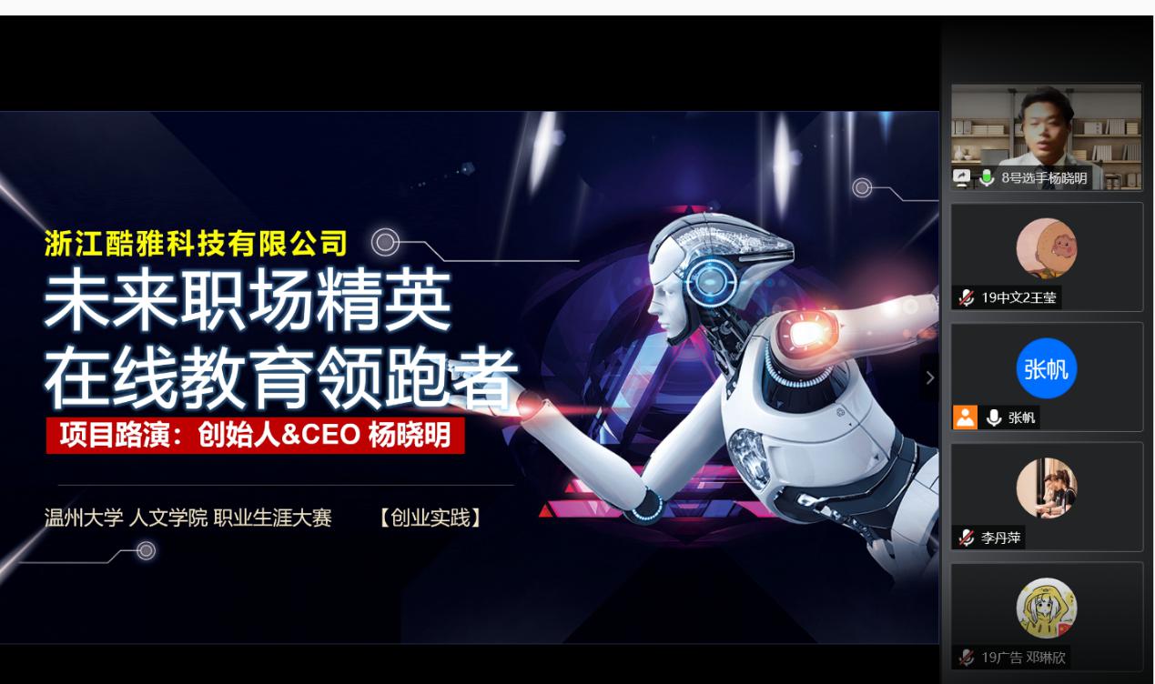 2020年5月15日18:30,樱花小说 在腾讯会议上举行了第六届职业生涯规划大赛决赛。东方学院就业指导教研室主任叶加德老师、浙江工贸职业技术学院就业教师高富春老师、温大招生与就业处生涯教育科科长洪艳老师、温大招生与就业处就业指导教研室主任朱丽莉老师和院学工办主任刘纪峰老师作为评委到场。