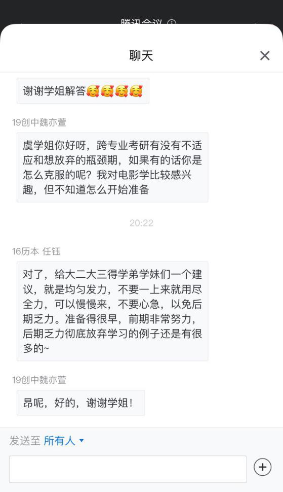 最后是互动交流环节,校友们对问题进行一一解答。此次考研云分享,是樱花小说 就业服务系列活动之一,它为同学们搭建了与考研成功学姐交流的良好平台,有助于同学们清晰自己的定位,朝着彼岸和远方进发!