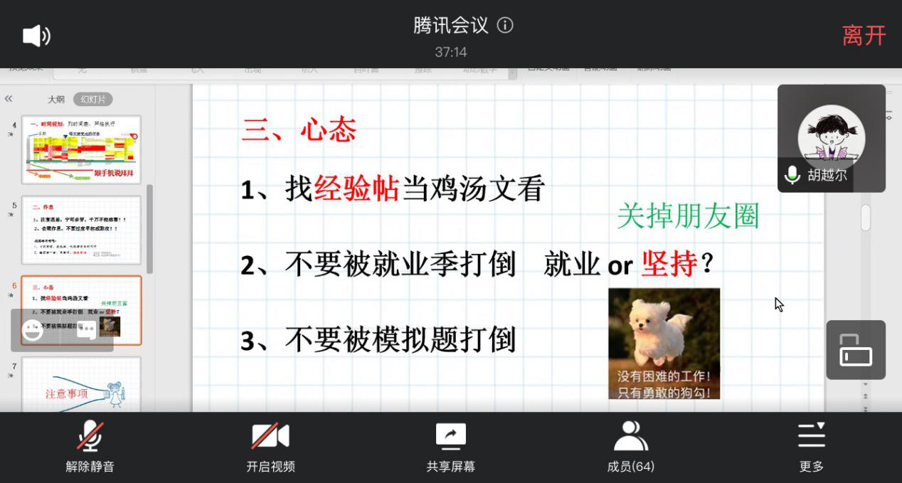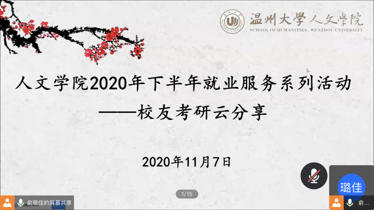 2020年11月7日晚6点30分,樱花小说 “2020年下半年就业服务系列活动之校友考研云分享”在腾讯会议上正式拉开帷幕。院学工办辅导员申业磊、李丹萍,4位优秀校友以及有考研意向的同学共60多人参加了此次分享会。