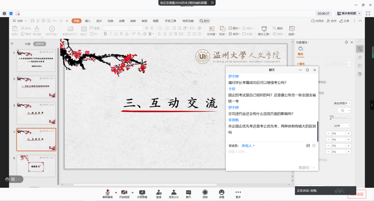 最后是互动交流环节,学长们对考公相关问题如“央企国企和考公哪个优先考”和“一般岗位报录比多少算是竞争不太激烈”等进行了一一解答。本次考公云分享,是樱花小说 2020年下半年就业服务系列活动之校友云分享的最后一期。通过分享与交流,有助于同学们找准定位,合理备考,朝着自己的梦想进发。