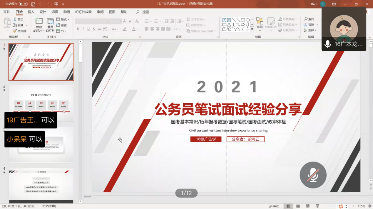 分享会伊始,院学工办辅导员李丹萍讲话,她期望大家在就业规划上早日找到自己的方向,并提前做好准备,未来找到一份满意的工作。随后,进入校友分享环节。16广告龙海云目前在衡阳市祁东县税务局任职。他从国考基本常识、历年数据、国考笔试、国考面试、政审体检五个方面展开分享。通过数据,他告诉大家不要被报考人数吓倒,要相信自己。同时他也仔细解读了笔试考察的各部分内容,分享了相关应考技巧。17文化创意学专业研究生刘海目前就职于云南省大理自治州洱源县税务局,他为我们讲述了自己的考试经历,并就公务员备考常见问题以及时间规划与方法实践做了介绍,他激励同学们:“道路千万条,实干第一条”。16广告张净衡考上了宁波市奉化区税务局,他主要分享了公考简介、岗位挑选、笔试备考和结构化小组面试流程,并鼓励同学们:“公考并没有想象中那么难”。