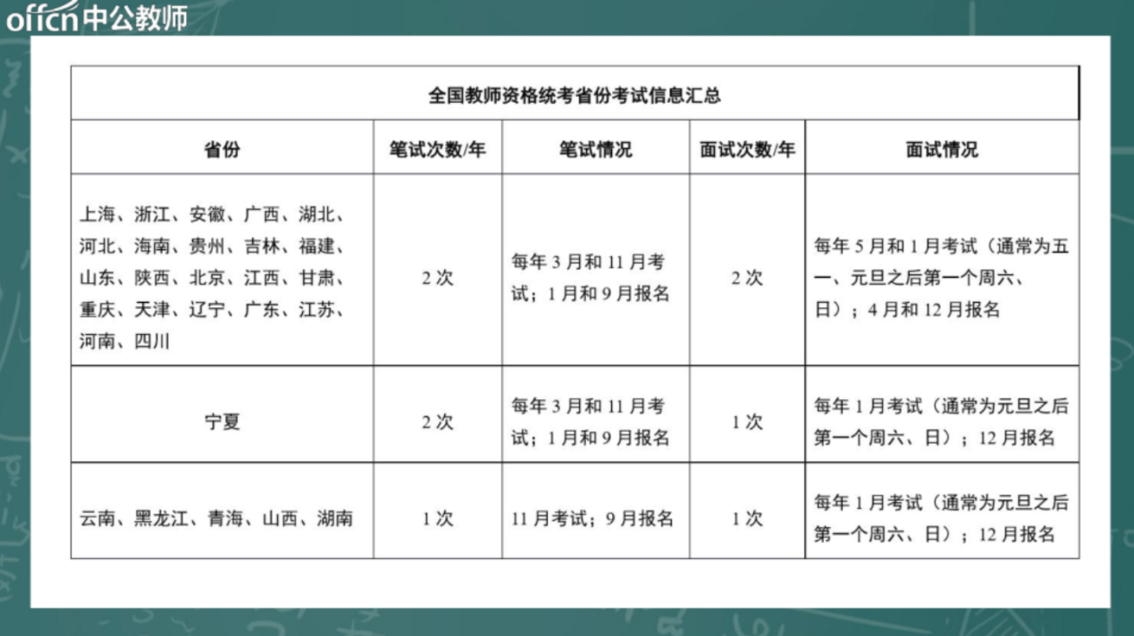 马老师对教师资格分类进行了详细的讲解,纠正了大家的大量错误想法,如“笔试面试通过后是否可以立即拿到教师资格证,或者是否还需要通过认证,如普通话考试等”,并给出了全国教师资格统考省份考试信息汇总与报名方式、考试时间。